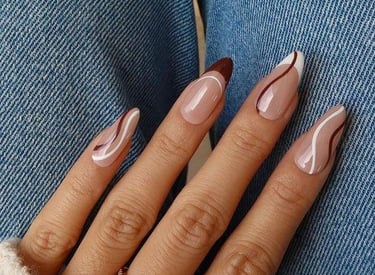 close-up photo of perfectly manicured hands with neutral beige and white nail polish in a minimalist setting